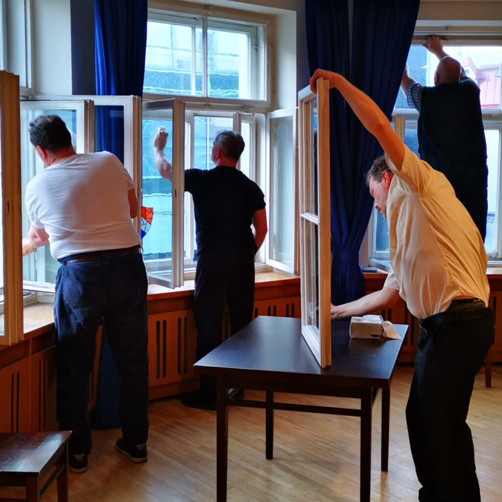 Kora vīri sarīkoja talku un nu mēģinājuma zālē tagad logi uz Tērbatas ielas pusi ir atbrīvoti no ielas putekļiem un dzidri. 15. junījā 2023. gadā