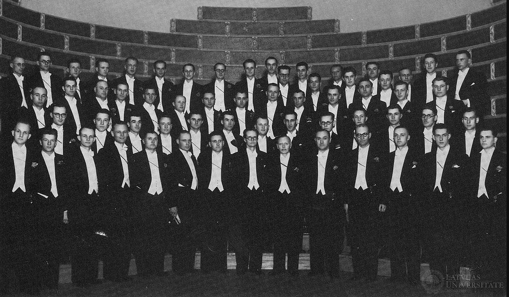 Kora kolektīvs. 1938. Pirmajā rindā (no kreisās, sestais): mākslinieciskais vadītājs T. Kalniņš. No: Universitas. Nr. 63, 1989.