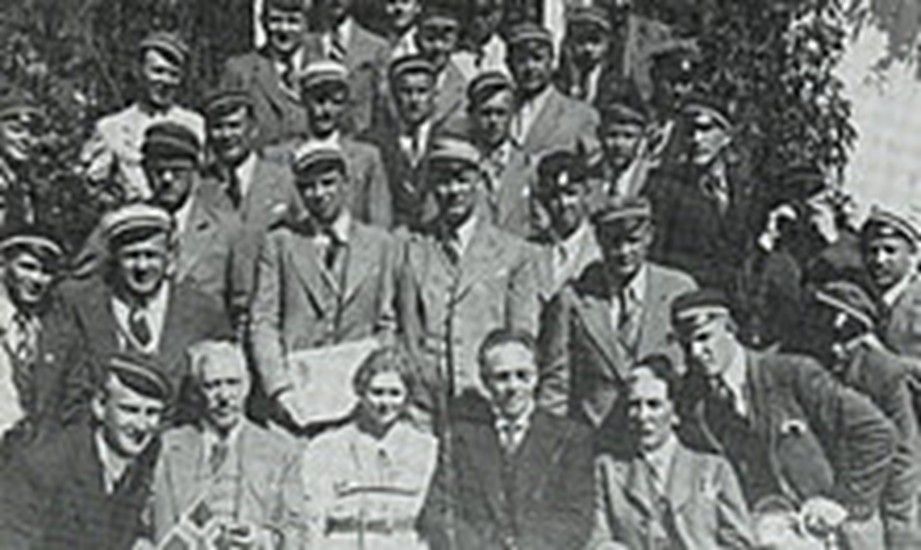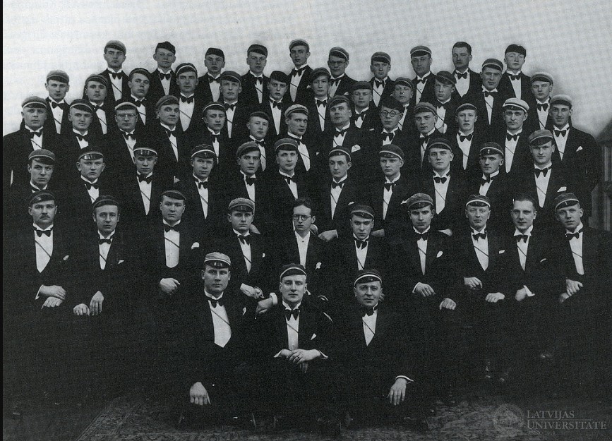 Kora kolektīvs. 1932. Otrajā rindā (vidū, bez deķeļa): mākslinieciskais vadītājs T. Kalniņš. No: Universitas. Nr. 63, 1989.