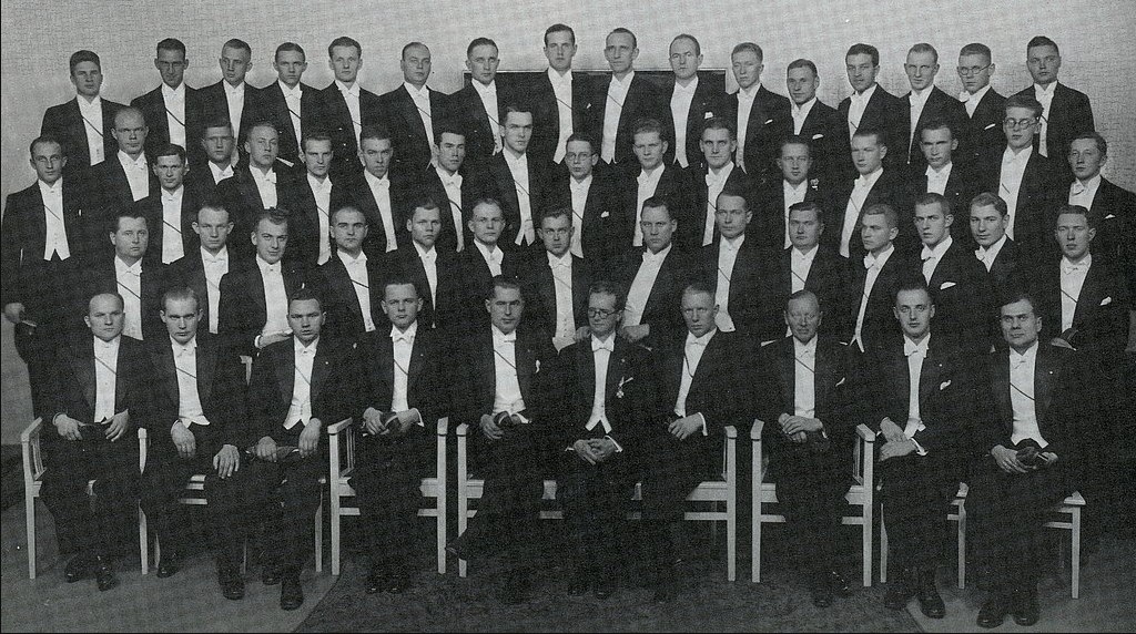 Vīru kora valde. 20. gs. 20. g. Pirmajā rindā (vidū): mākslinieciskais vadītājs T. Kalniņš. No Raimonda Arāja personīgā arhīva.