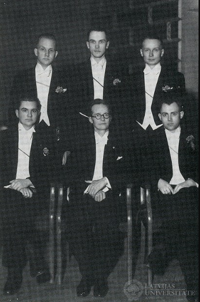 Vīru kora valde. 1943. Pirmajā rindā (no kreisās): valdes loceklis P. Ābols, diriģents T. Kalniņš, A. Lacums. Otrā rinda (no kreisās): H. Liepiņš, E. Vītols, V. Landsbergs. No: Universitas. Nr. 63, 1989.